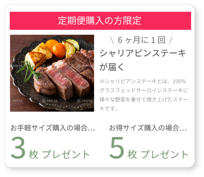 お手軽サイズとお得サイズの2種類の定期便(サブスク)をご用意しております。毎月下記5種類をお届けいたします。